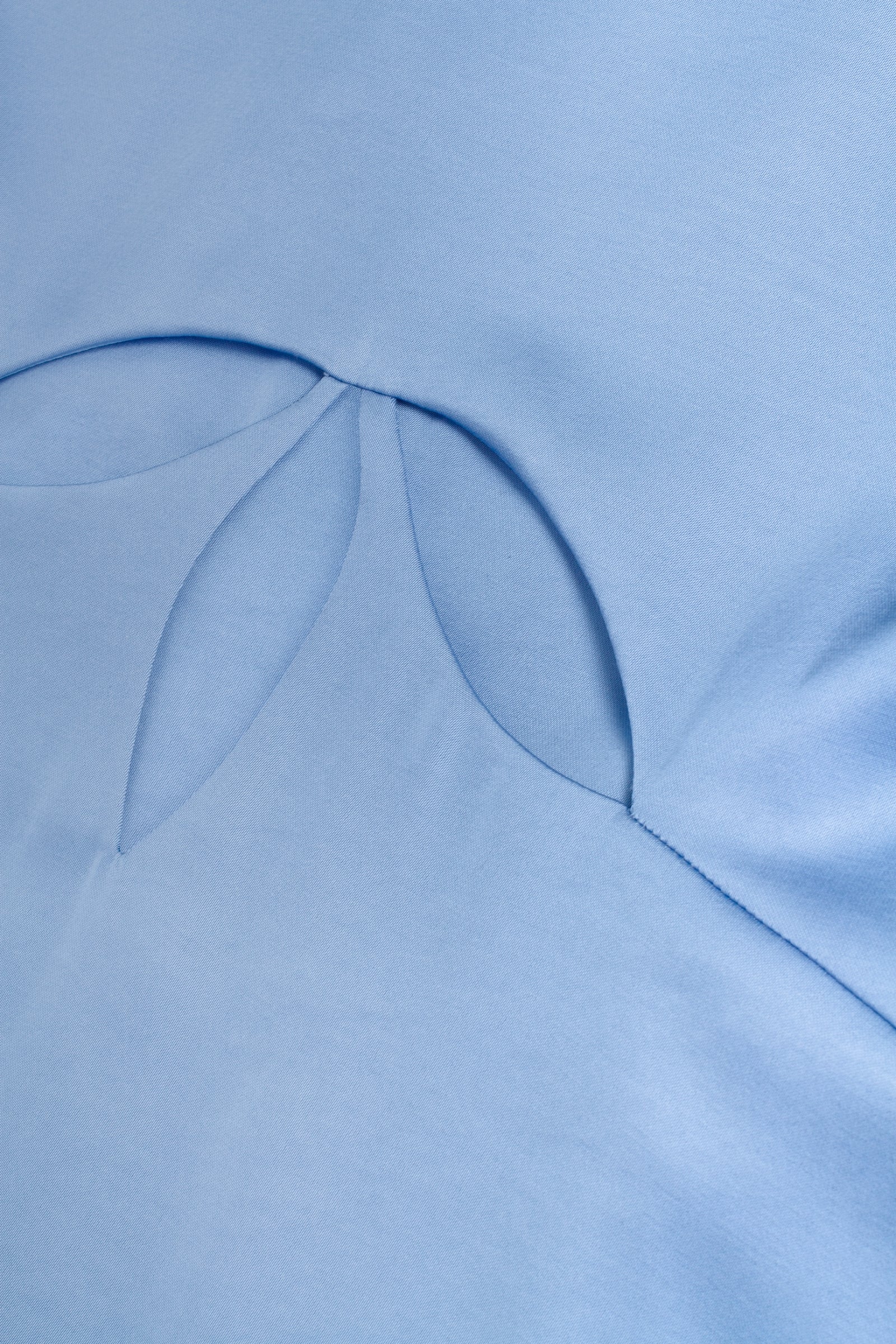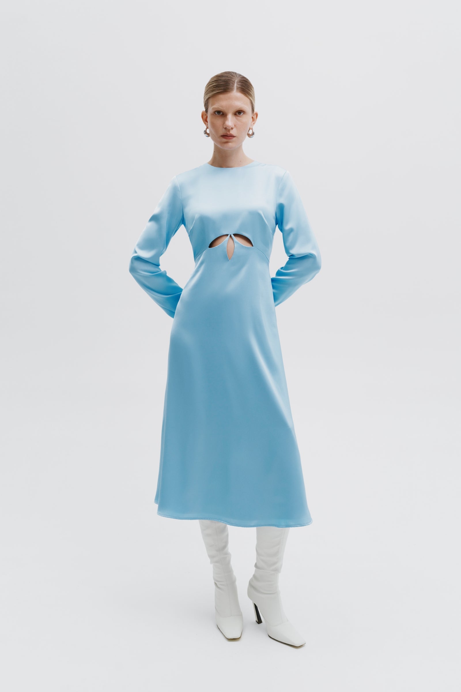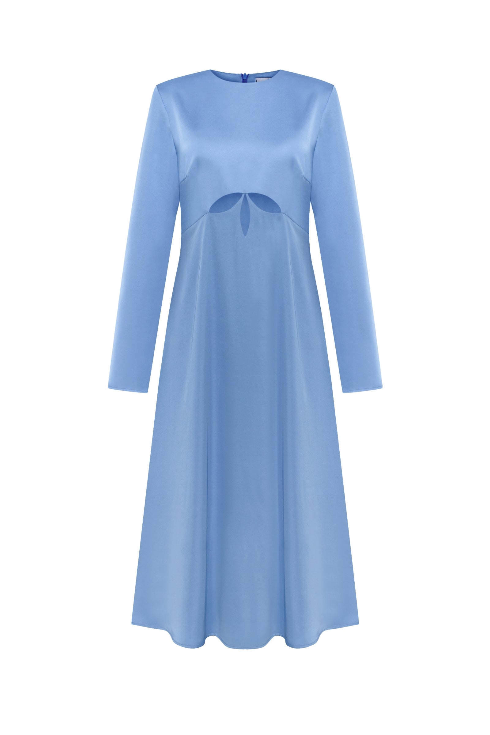 Fitted long-sleeve midi dress with an A-line skirt in double-layered satin, featuring decorative petal-shaped cutouts at the front and a back zipper.