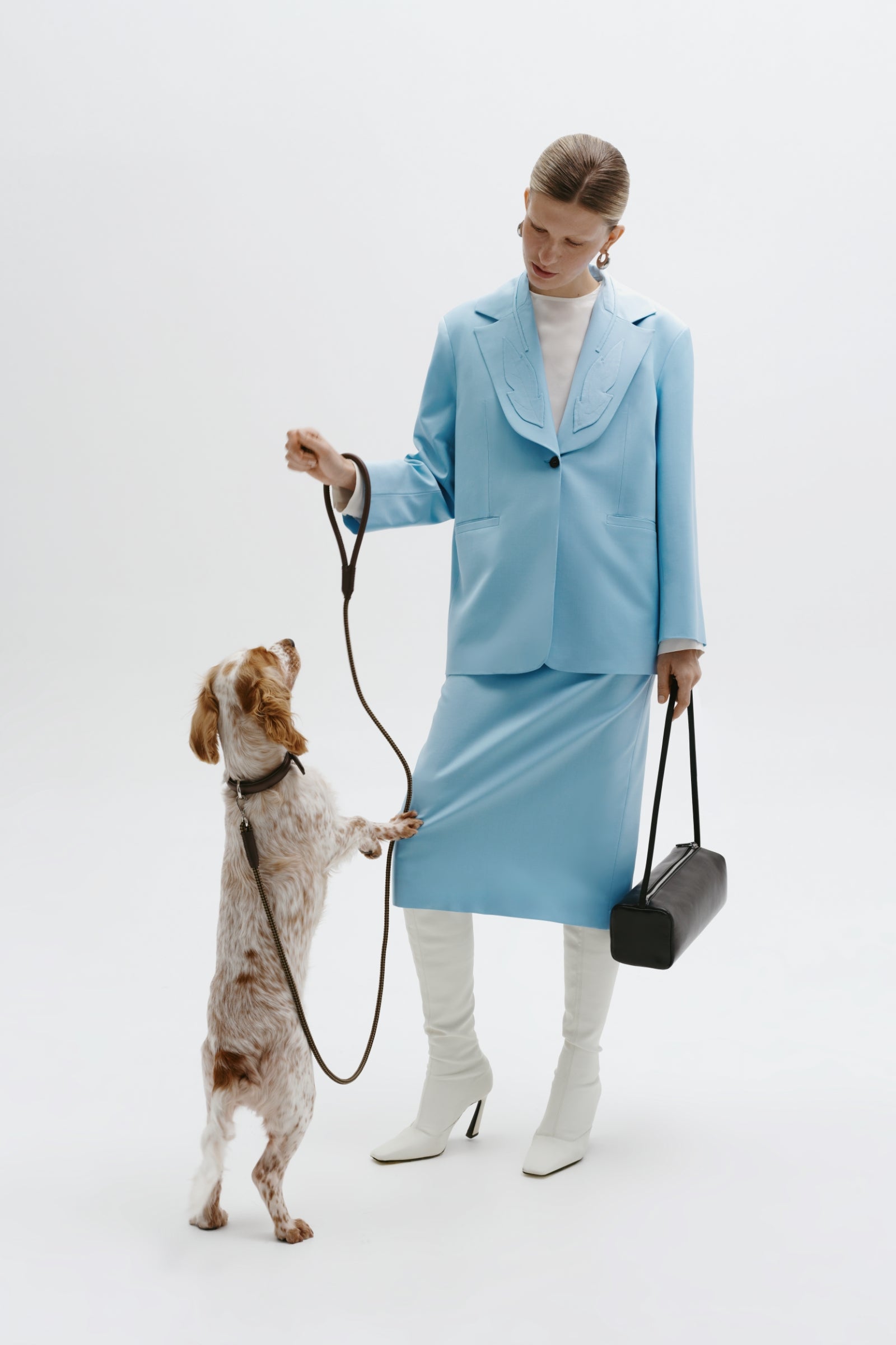 Oversized straight-cut jacket with wide sleeves, welt pockets, and decorative detailing along the lapels