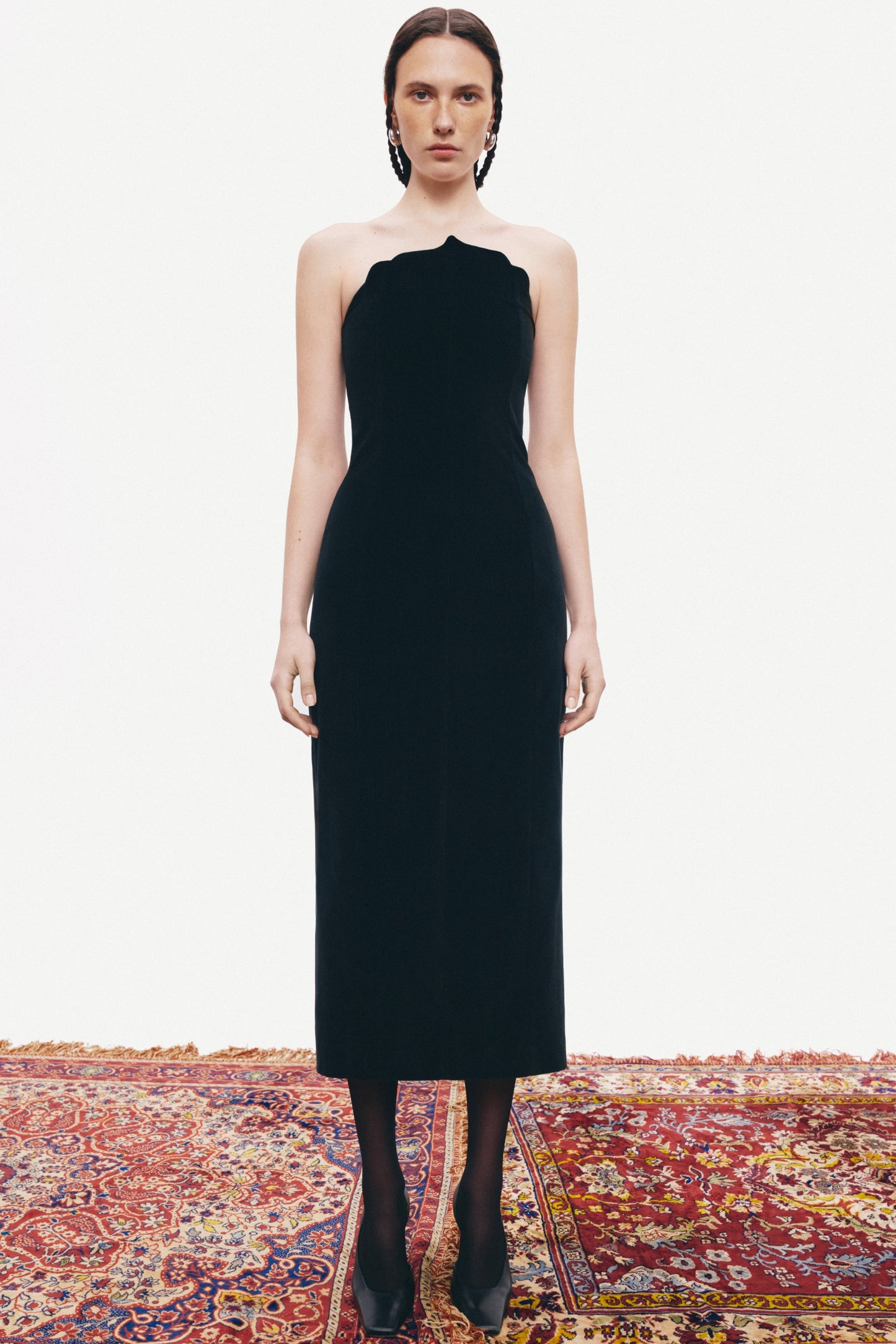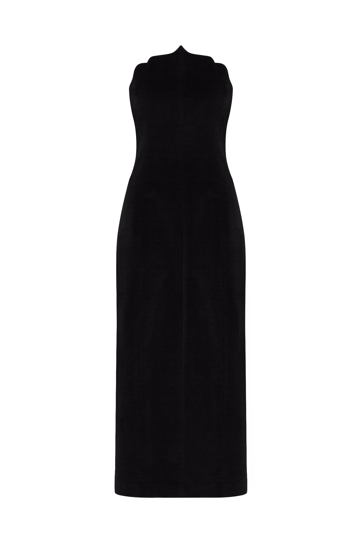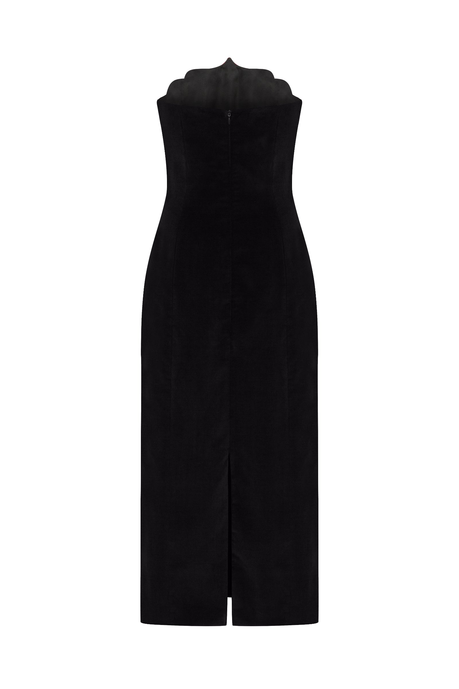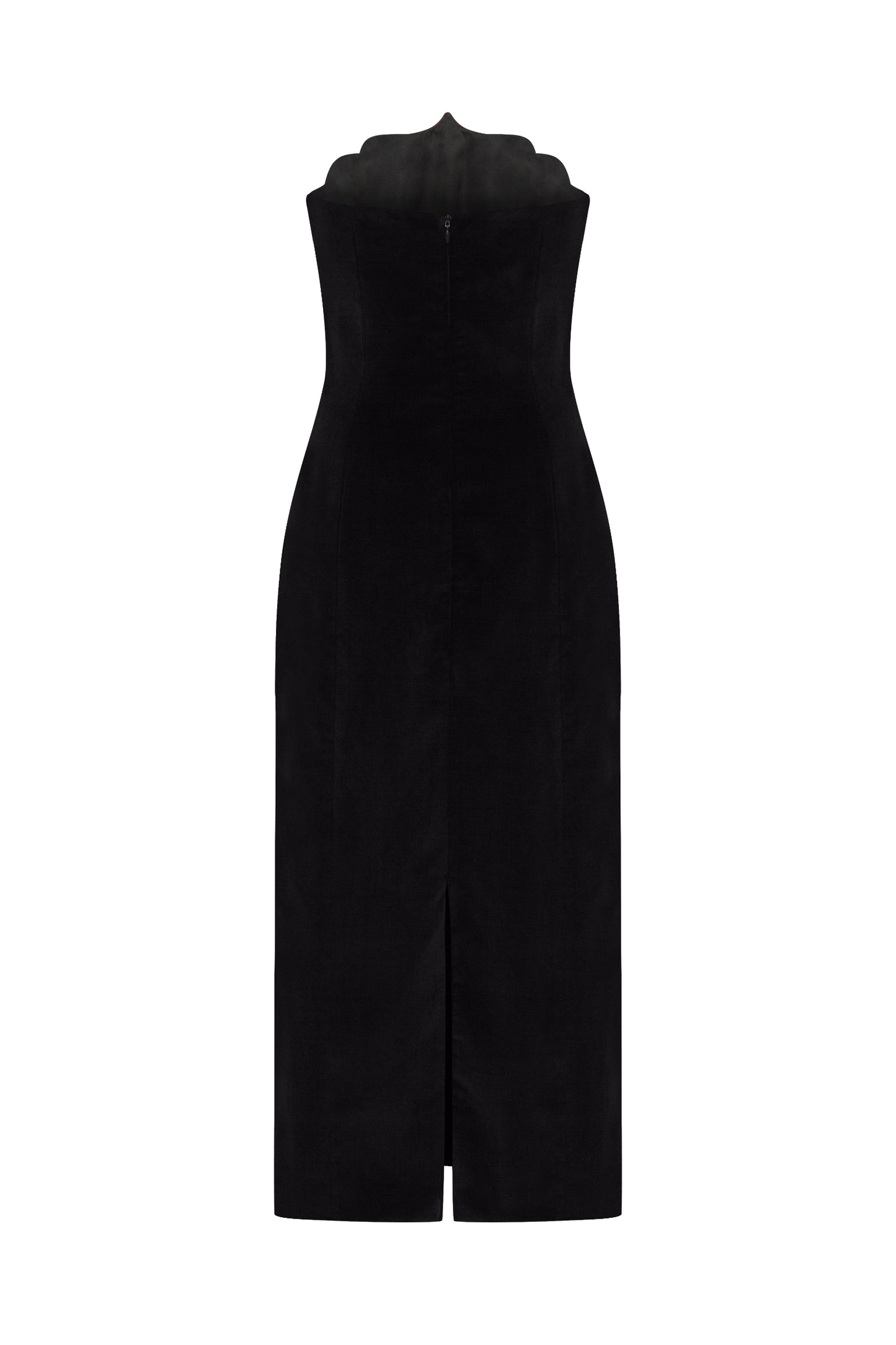 Velvet midi dress with a shaped top edge. Features a back closure and a center slit
