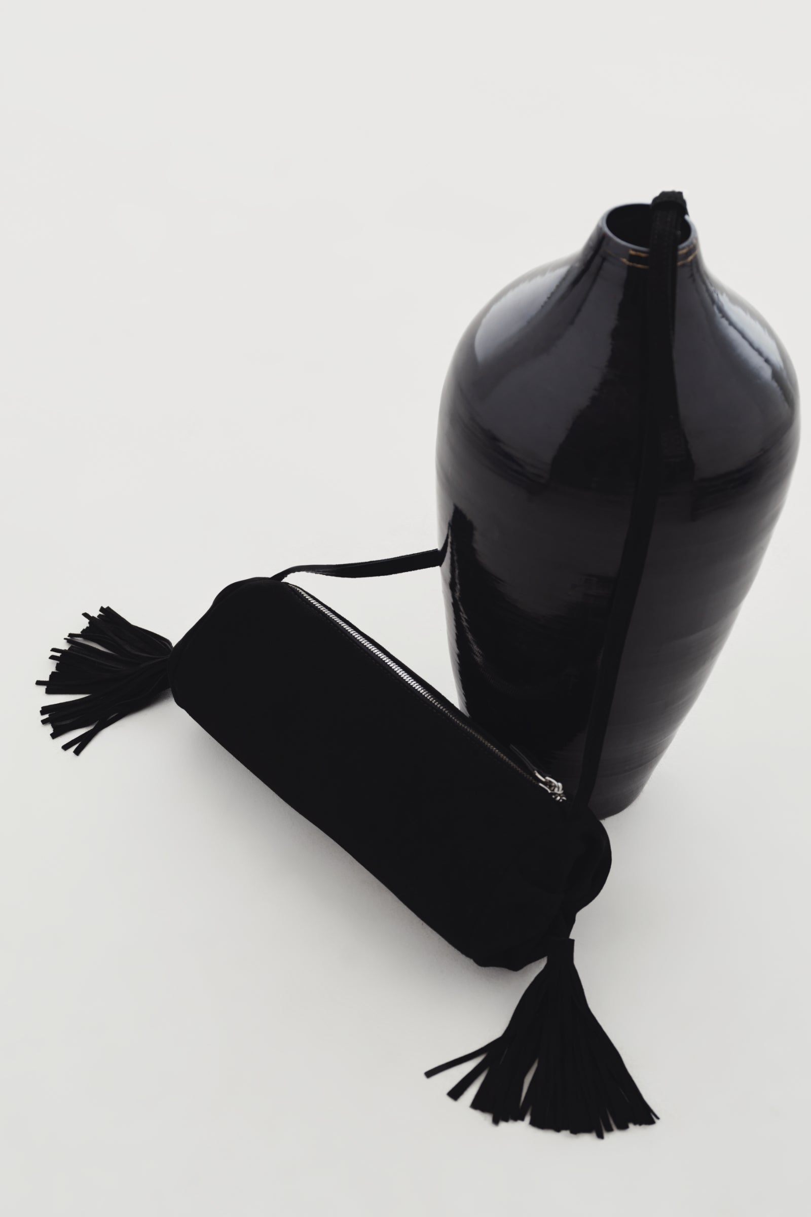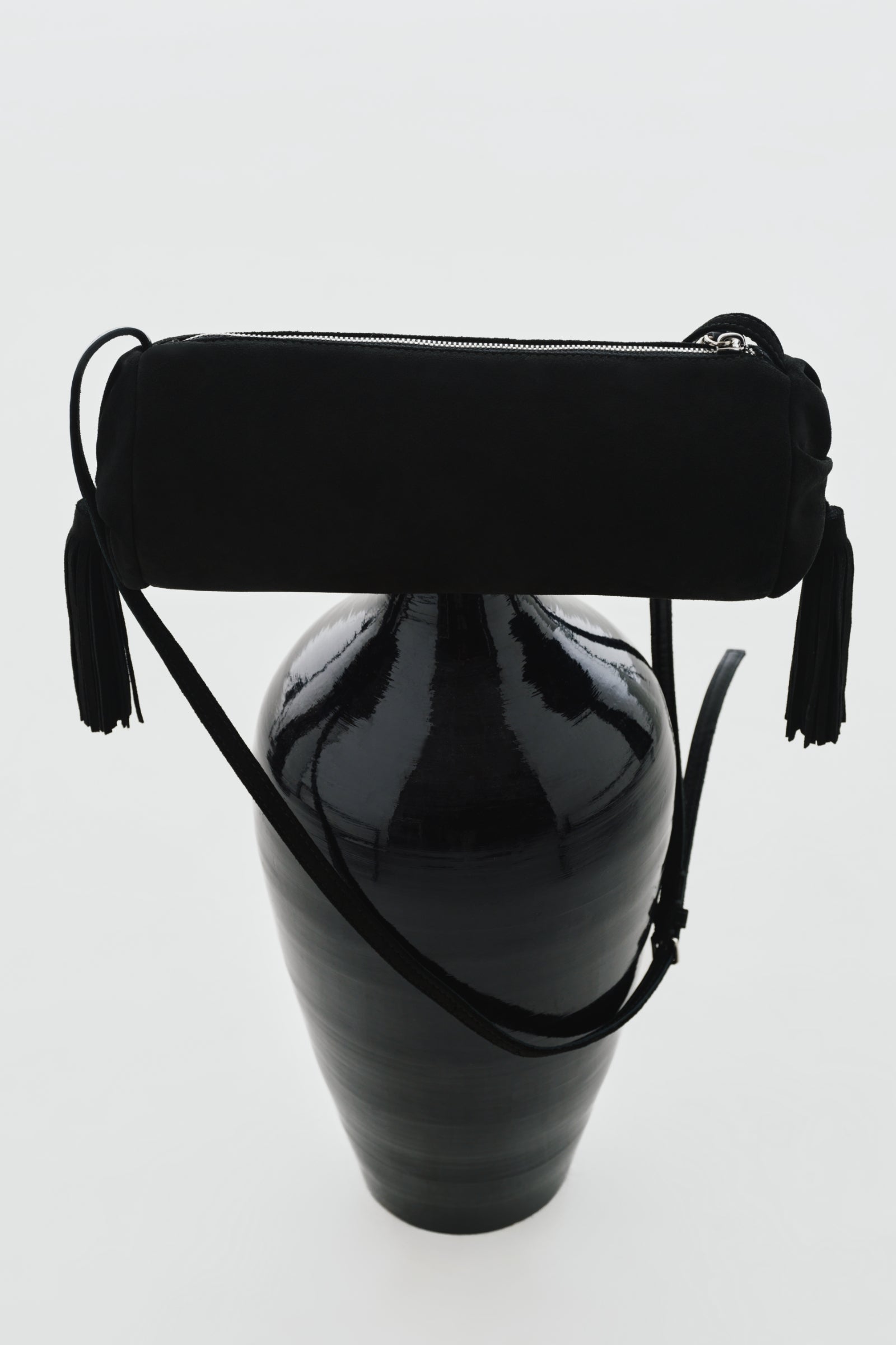 Циліндрична замшева сумка через плече з регульованим тонким ремінцем та декоративними китицями